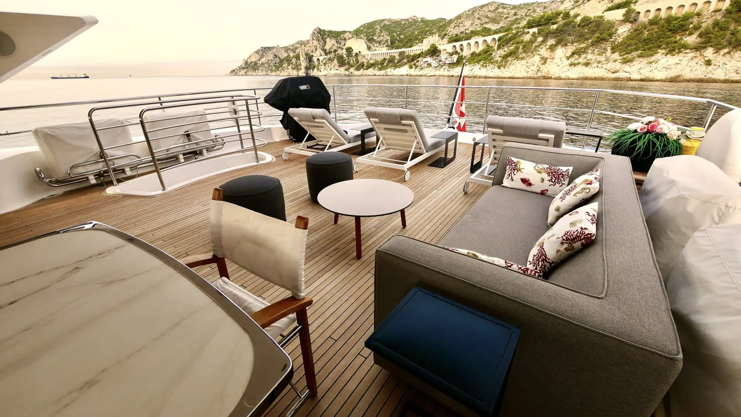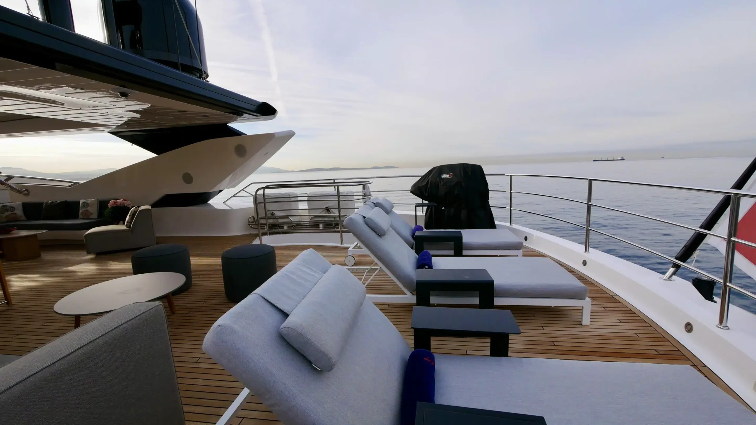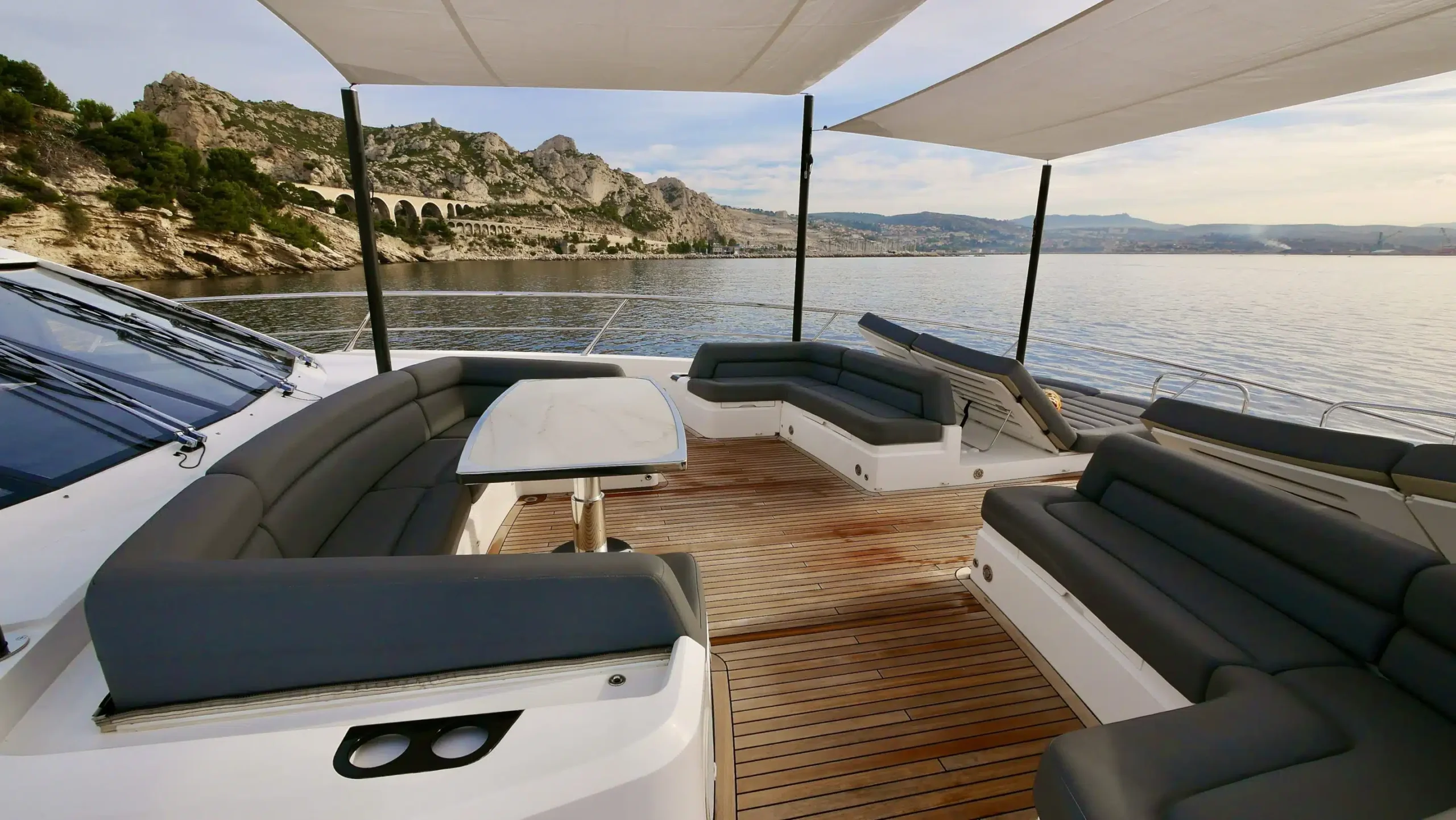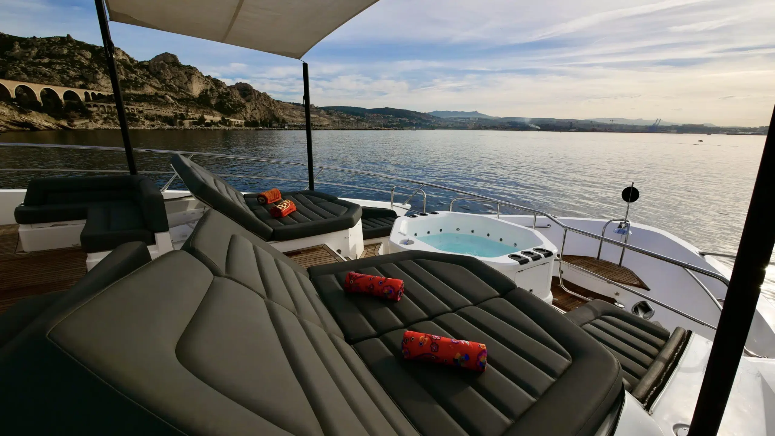 Un dels grans atractius del SURVIVOR 2 és el seu jacuzzi situat a proa, que ofereix un entorn idíl·lic per relaxar-se admirant l’horitzó. El flybridge espaiós, equipat per a àpats a l’aire lliure i moments de convivència, és el lloc ideal per gaudir d’un còctel davant la posta de sol o organitzar una recepció privada al mar.
