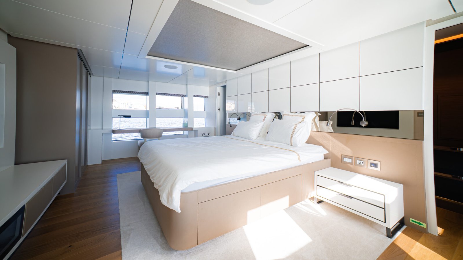 Ogni cabina beneficia delle finiture 2025 del cantiere Numarine — materiali contemporanei, illuminazione a LED, sistema audiovisivo integrato, aria condizionata silenziosa.